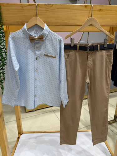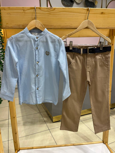 ست پیراهن و شلوار و کمربند پسرانه،ترک کالکشن،کیفیت عالی و بسیار خوش استایل از ۶تا ۹سال -پیراهن آبی کمرنگ و شلوار کرم مخصوص پسرای خوش تیپ