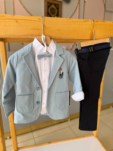 ست پیراهن و شلوار و کمربند و پاپیون پسرانه،ترک کالکشن،کیفیت عالی و بسیار خوش استایل از ۹تا ۱۲سال -پیراهن آبی کمرنگ و شلوار کرم مخصوص پسرای خوش تیپ و نوجوانناموجود