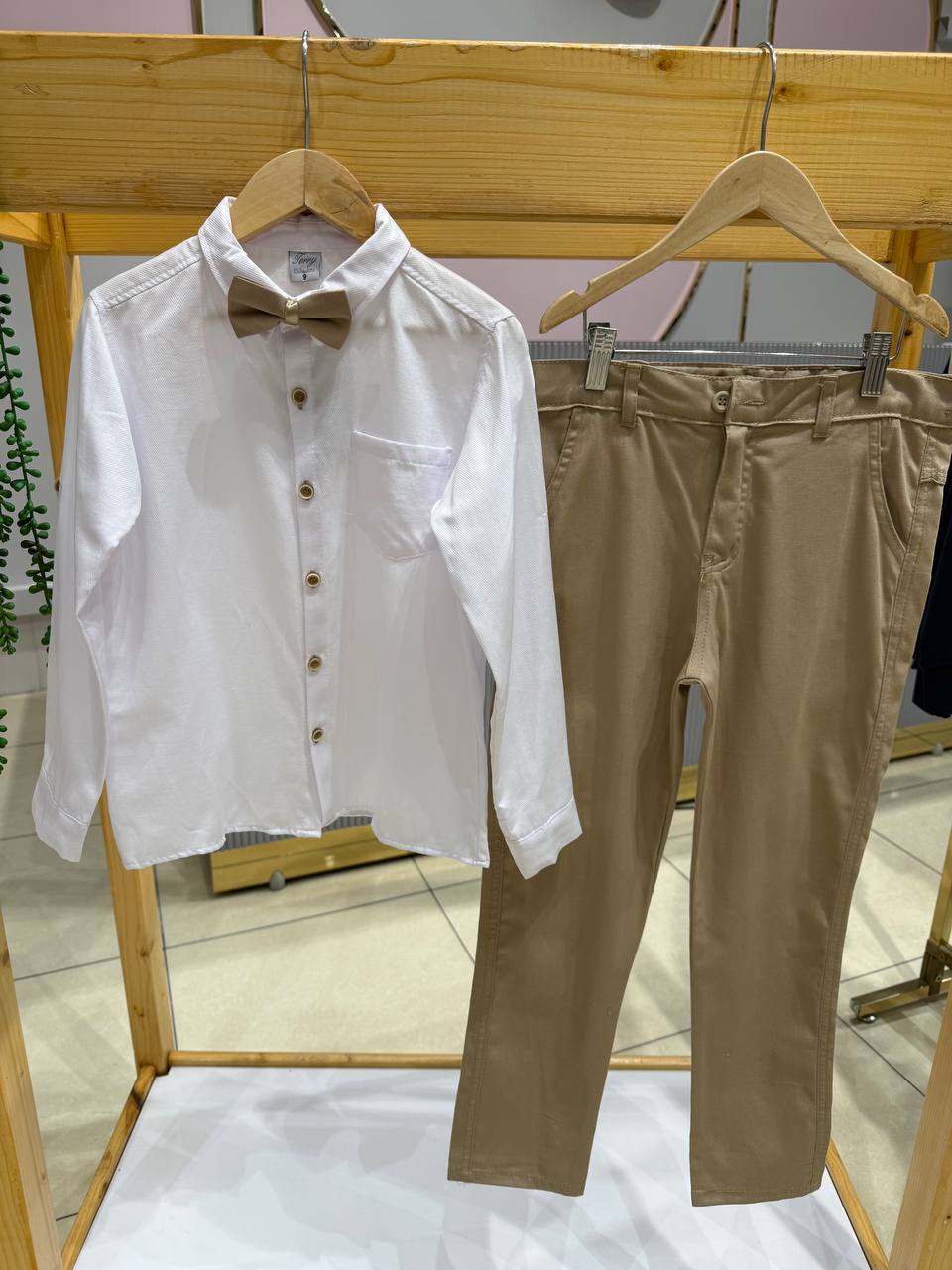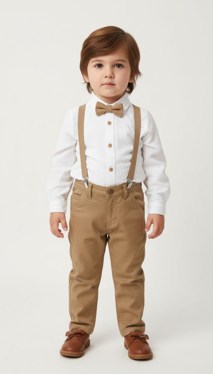 ست پیراهن و شلوار و پاپیون پسرانه،ترک کالکشن،کیفیت عالی و بسیار خوش استایل از ۹تا ۱۲سال -پیراهن سفید و شلوار کرم مخصوص پسرای خوش تیپ و نوجوان
