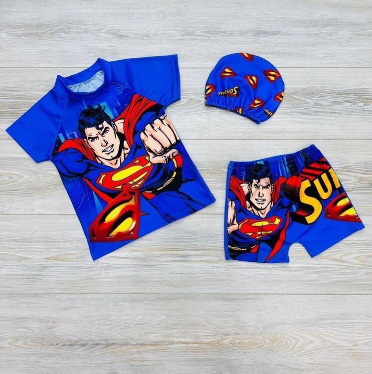 ست مایو سه تیکه کلاه و تیشرت و شلوارک ترک طرح سوپرمن از 3تا 10سال