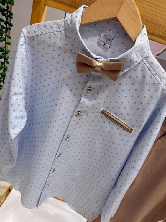 ست پیراهن و شلوار و کمربند و پاپیون پسرانه،ترک کالکشن،کیفیت عالی و بسیار خوش استایل از ۹تا ۱۲سال -پیراهن آبی کمرنگ و شلوار کرم مخصوص پسرای خوش تیپ و نوجوان