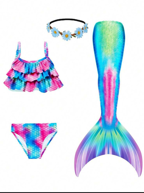 مایو پری دریایی 4 تکه وارداتی شامل بالاتنه و شورت و بال پری دریایی و تل مو از ۵ تا 12 سال باکیفیت عالی