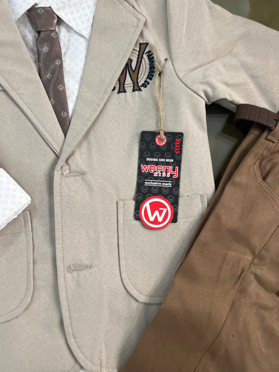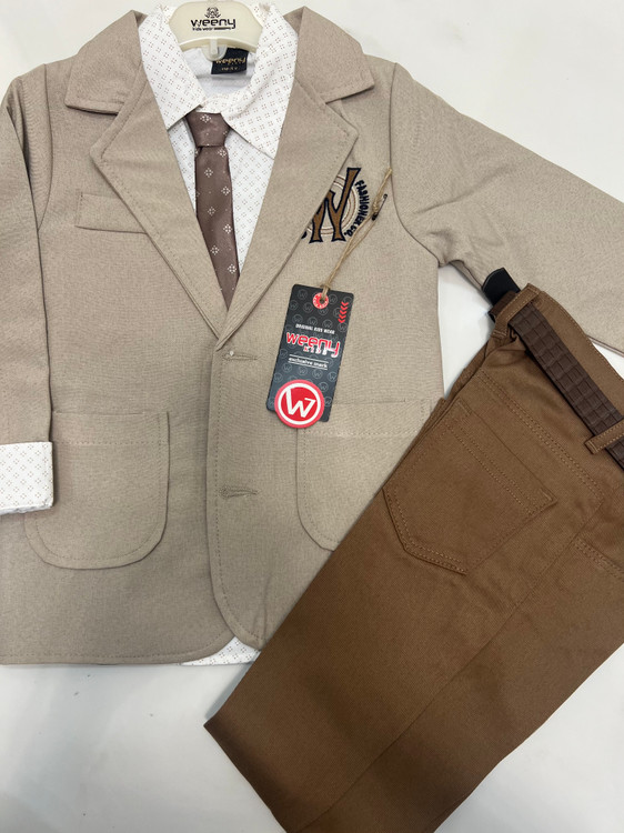 ست پسرانه مجلسی وارداتی برند weeny ترک شامل کت و شلوار و پیراهن و کروات و کمربند از 5 تا 8 سال-پارچه کت فاستونی و شلوار کتان نخ می باشد.