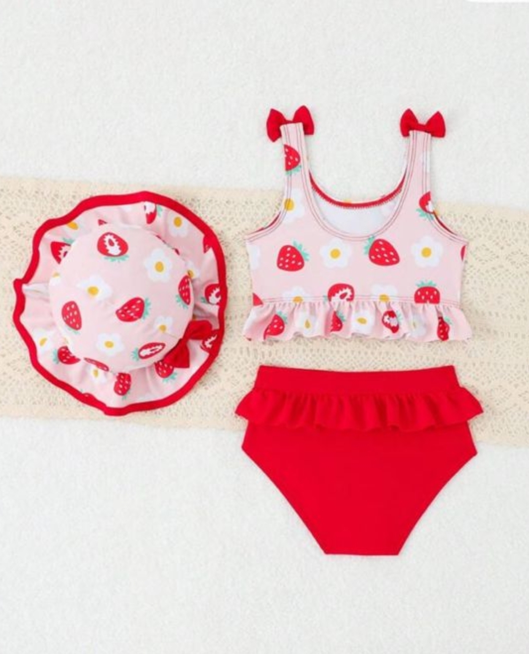 سه تکه مایو دو تکه به همراه کلاه دخترانه طرح توت فرنگی خیلی ناز و کیوت اورجینال برند shein از 6 ماه تا 3سال