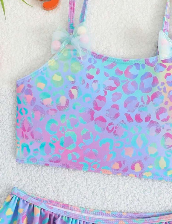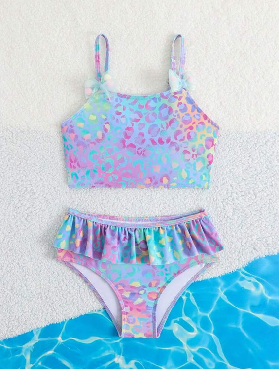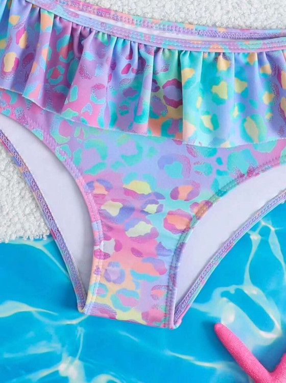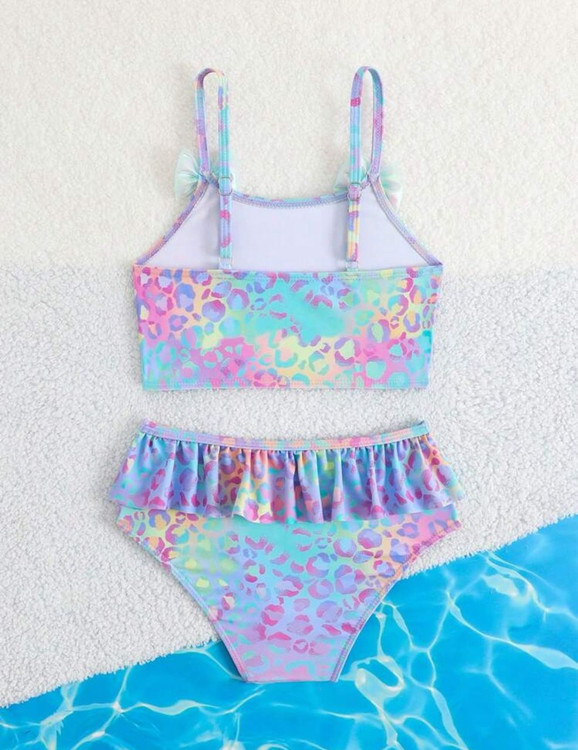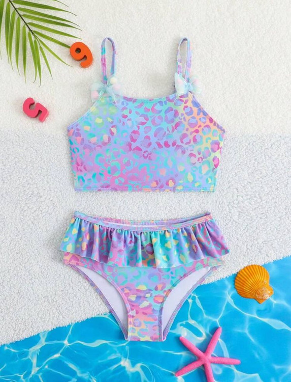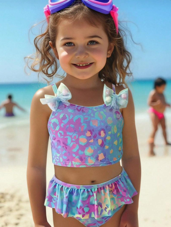 مایو دو تکه دخترانه طرح هولوگرامی رنگی پلنگی اورجینال برند با کیفیت shine مناسب 6تا 7سال