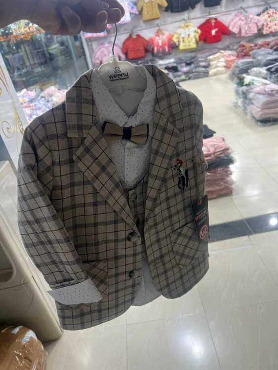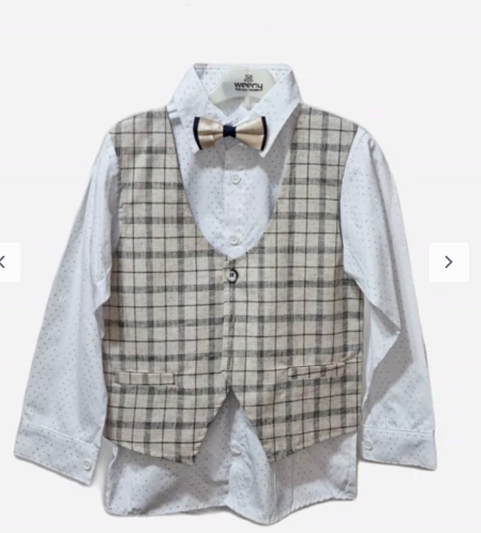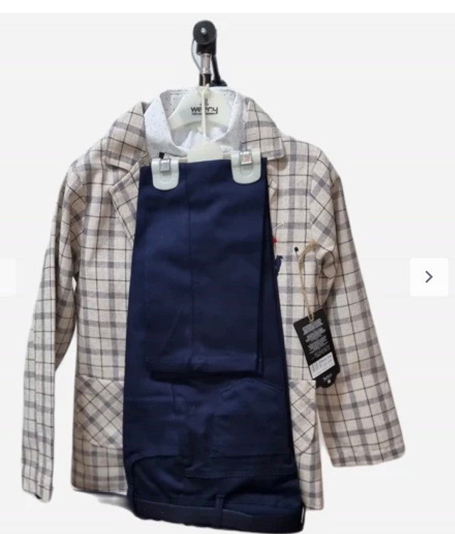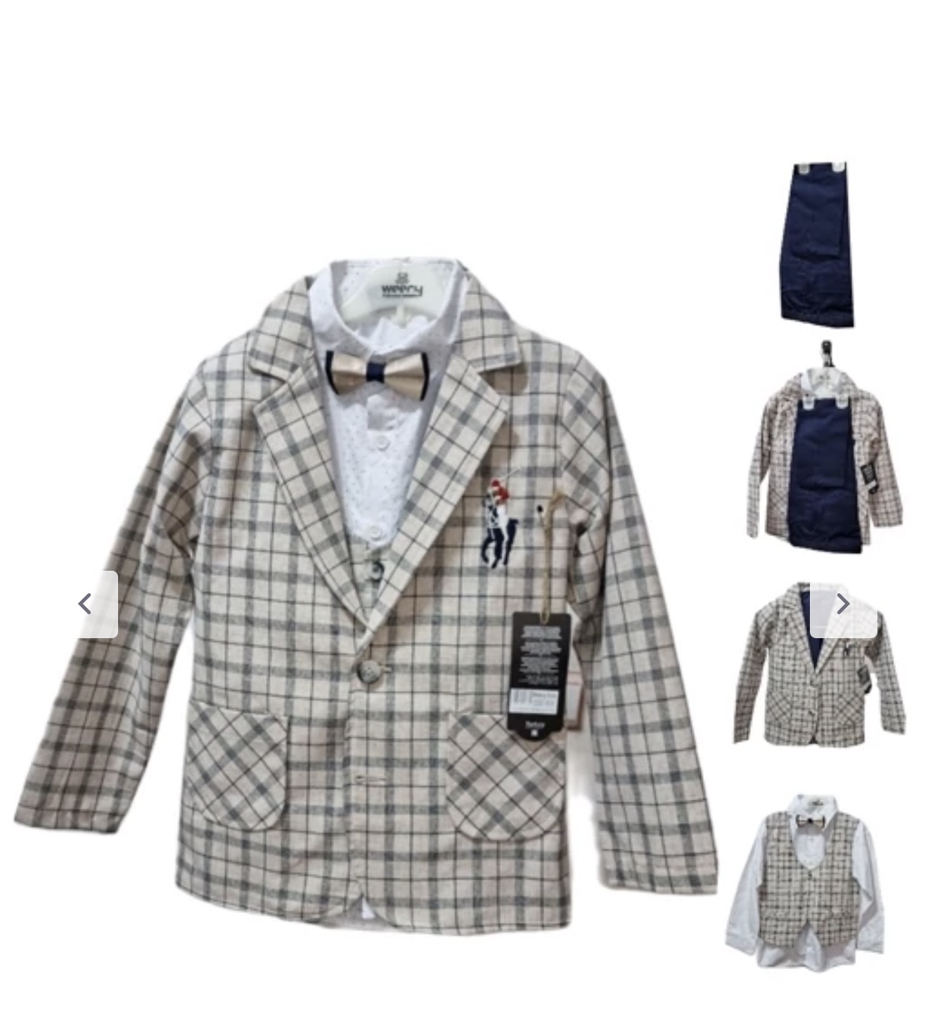 ست ۶تکه کت کرم و شلوار کتان سرمه ای پسرانه ترک از برند weeny -کیفیت عالی و مناسب ۴فصل شامل کت آستردار و جلیقه و پیراهن و پاپیون و شلوارکتان وکمربند از ۵تا ۸سال